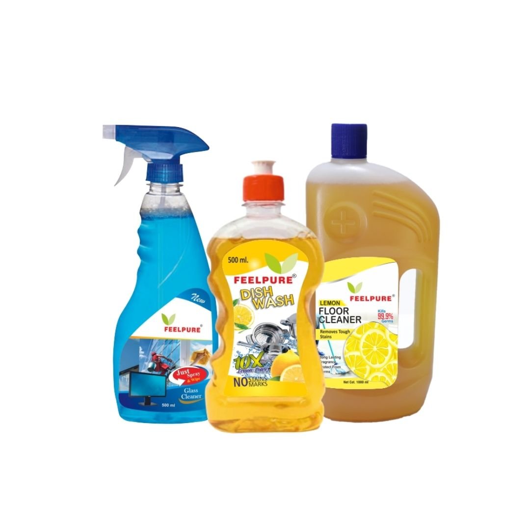 The Kitchen & Surface Cleaning Combo is a comprehensive cleaning solution designed to maintain hygiene, cleanliness, and shine in kitchens and high-use household surfaces. This thoughtfully curated combo includes three essential cleaning products—Dishwash Gel, Floor Cleaner, and Glass Cleaner—each formulated to deliver powerful cleaning performance, grease removal, and long-lasting freshness.